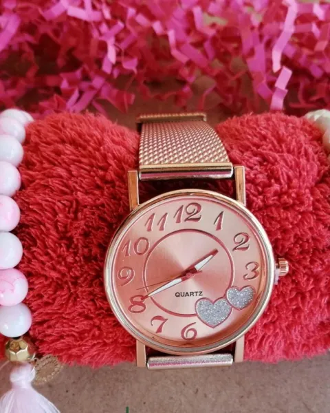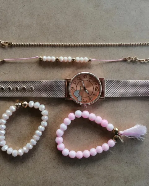 Reloj con pulseras. Juego de 4 pulseras de fantasía con relog rosa dorado, extensible de plástico