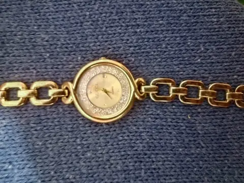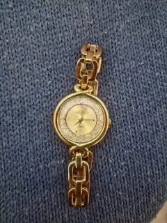 Reloj dorado, para dama, único defecto se le cayeron brillos internos pero no afecta si funcionamiento, exelentes condiciones, sirve de correa