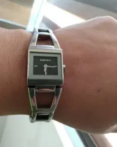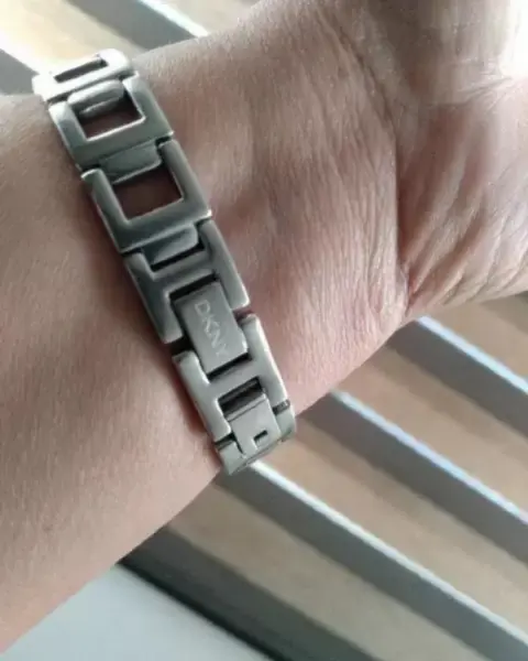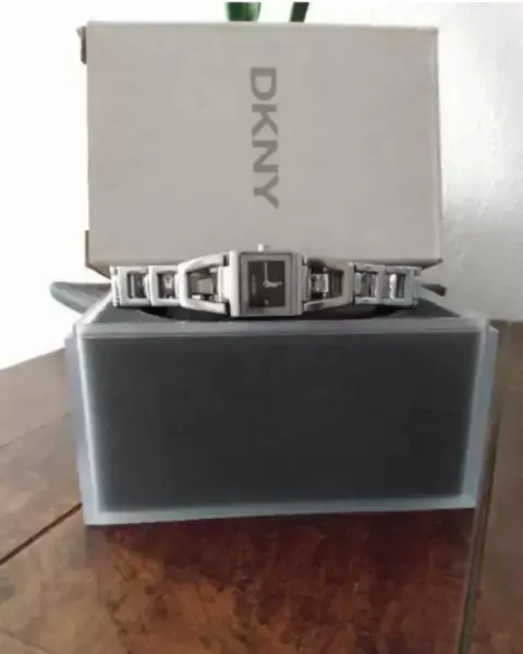 Reloj DKNY color plata interior Negro. Bonito reloj en color plata con el interior Negro, usado, algunos rayones por el uso en el cristal pero no son muy visibles, lleva todos sus eslabones, tiene pila nueva!