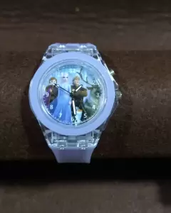 Reloj Frozen. Reloje analógico con lucesMaterial: siliconaLleva dos baterías de botón dentro (uno es responsable de la necesidad de iluminación, y el otro de la hora)Para la emisión de luz se pulsa el primer botón del reloj.El reloj encenderá la luz durante unos segundos.La luz cambia de colores.