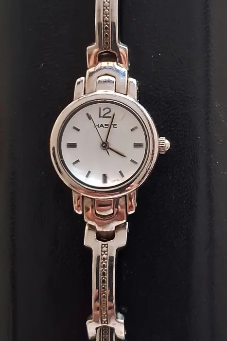 Reloj Haste vintage. Reloj Retro para dama, Vintage de la marca Haste. Color plata con carátula en color blanco y números en plateado.Leyenda en la caratula: Haste, Stainless Steel Back, Japan Movt, 2035.Acero inoxidable. Sin defecto, se usó en 4 ocasiones. Ideal para coleccionistas.Funcionando correctamente con batería nueva.Sin caja.Ya no se fabrica.$ 1,300 Precio a tratar después de ver físicamente el producto.