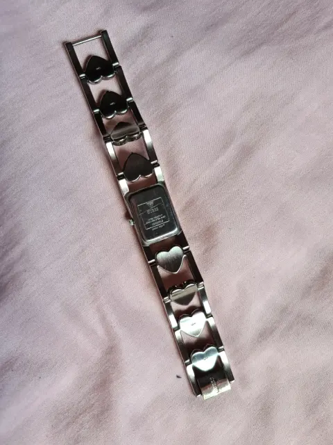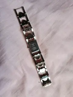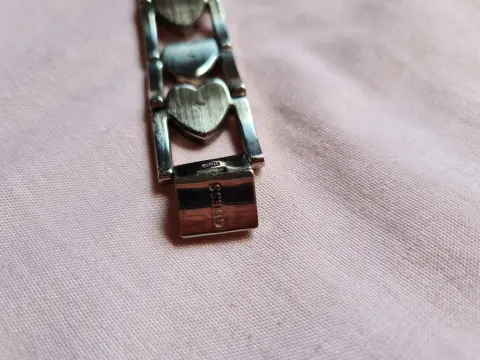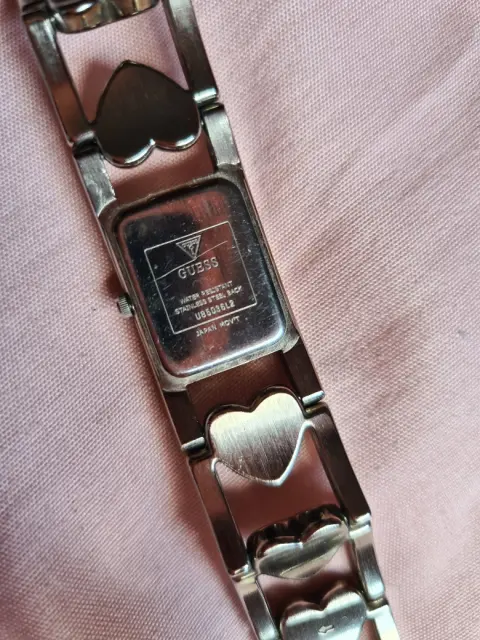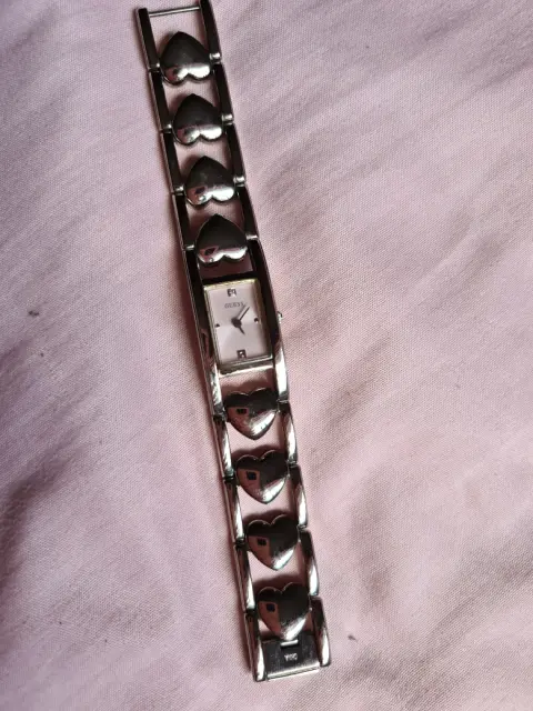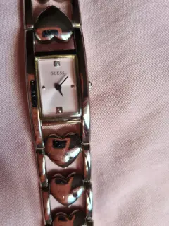 Reloj analógico marca Guess, plateado de corazones. Uso regular, ligeros rayones por el uso, casi imperceptibles; y por el momento no tiene pila.