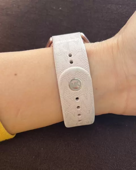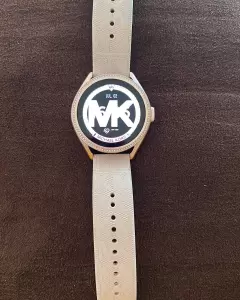 Smartwatch Michael Kors; El smartwatch MKGO Gen 5 de 43 mm ofrece un aspecto deportivo y glamuroso con una correa de caucho vainilla con logotipo, bisel dealuminio en tono rosa pálido con cristales.