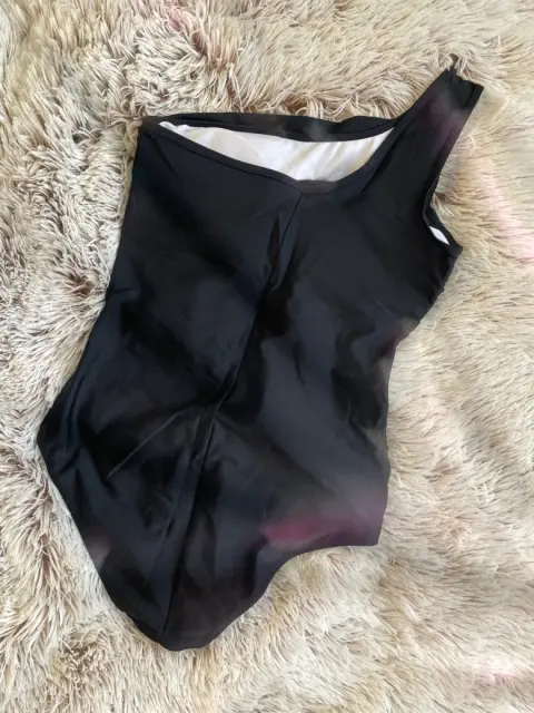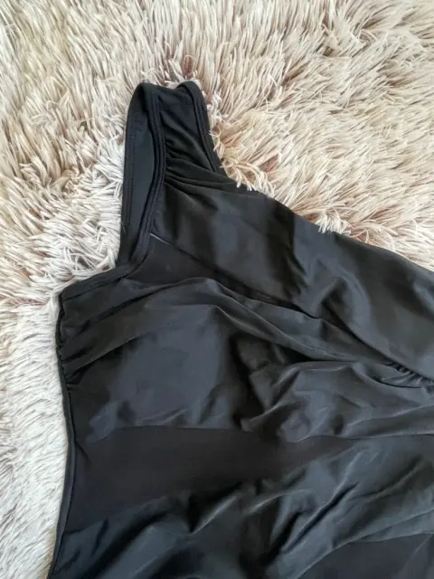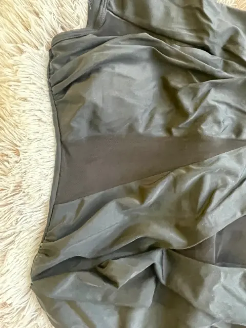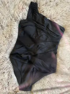 Bello traje de baño con malla. Cómoda y guapa. Cuenta con copas removibles y detalles de paneles de malla. La luz de la foto hace que varíe el color, es totalmente negro. Sin detalles