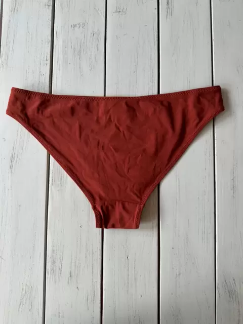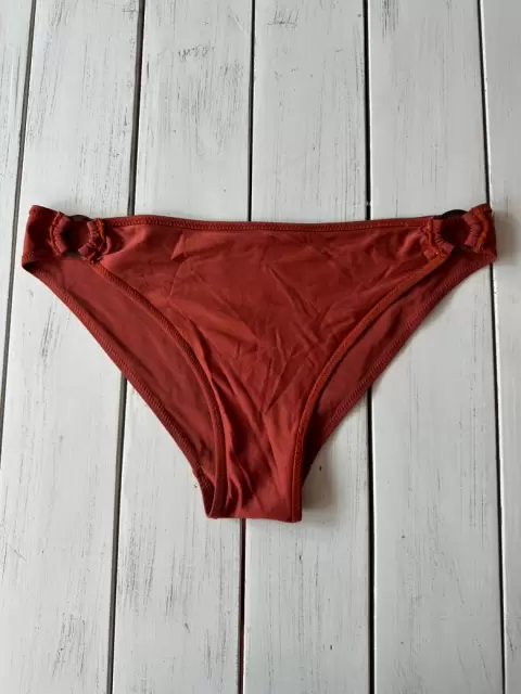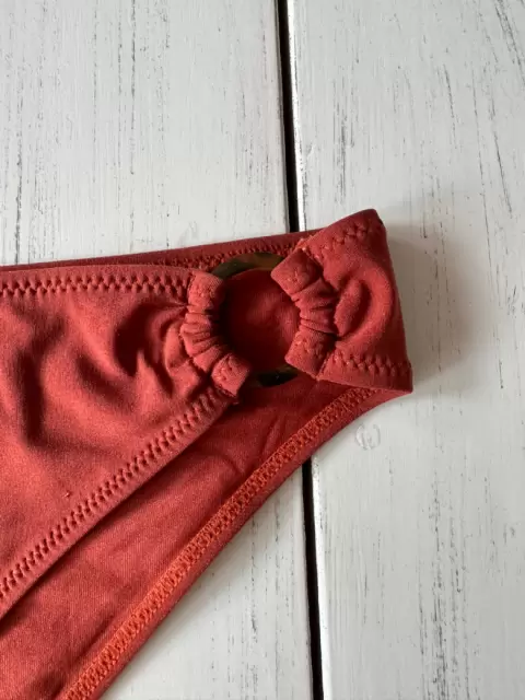Bottom de bikini, color terracota con aros tipo carey a los lados de la cadera. Talla: 4 Medidas: 36 cm de cintura, en pierna 24.5 cm medido diagonalmente.
