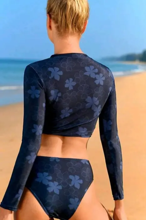 Precioso traje de baño nuevo conjunto de 2 piezas, su color es negro con detalles de flores azul oscuro. 82% poliéster, 18% elastano. almohadillas extraíbles en parte superior, talle alto.Medidas: De hombro a hombro 35cm, largo de top 36 cm, largo de la manga 55 cm, pecho 79cm.Bikini medidas: contorno caderas 78 cm, contorno cintura: 69-94 cm, largo 27 cm