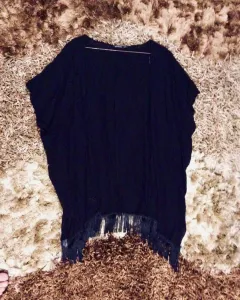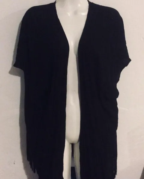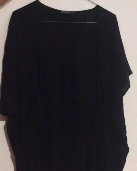 Kimono negro de tela plisada muy fresco. Abierto, 3/4 de largo, mangas anchas, tiene barbitas en la parte inferior. Súper cómodo, úsalo en la playa de salida o en la ciudad para andar cómoda