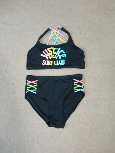 Justice bikini 2 piezas para niña.. Justice Bikini Deportivo de 2 Piezas niña con Multi correa y Detalle de Encaje talla grande 10-14. Medidas: parte superior 26 cm largo ( con tirantes) 14 cm de alto top ( sin tirantes) y 33 cm de ancho.Parte inferior: 27 cm de largo, 60 cm de ancho de cintura y 64 cm de cadera.Materiales: 84% poliéster reciclado y 16% spandex.Usado en una ocasión.