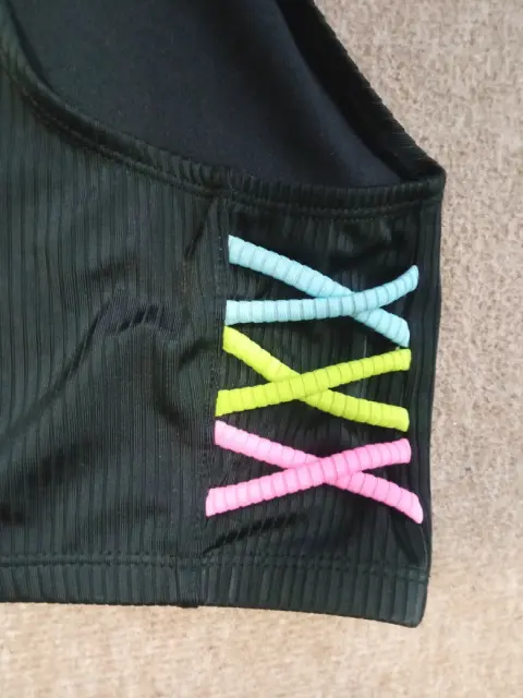 Justice Bikini Deportivo de 2 Piezas niña con Multi correa y Detalle de Encaje talla grande 10-14. Medidas: parte superior 26 cm largo ( con tirantes) 14 cm de alto top ( sin tirantes) y 33 cm de ancho.Parte inferior: 27 cm de largo, 60 cm de ancho de cintura y 64 cm de cadera.Materiales: 84% poliéster reciclado y 16% spandex.Usado en una ocasión.