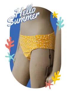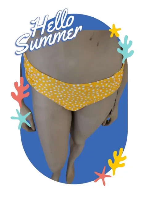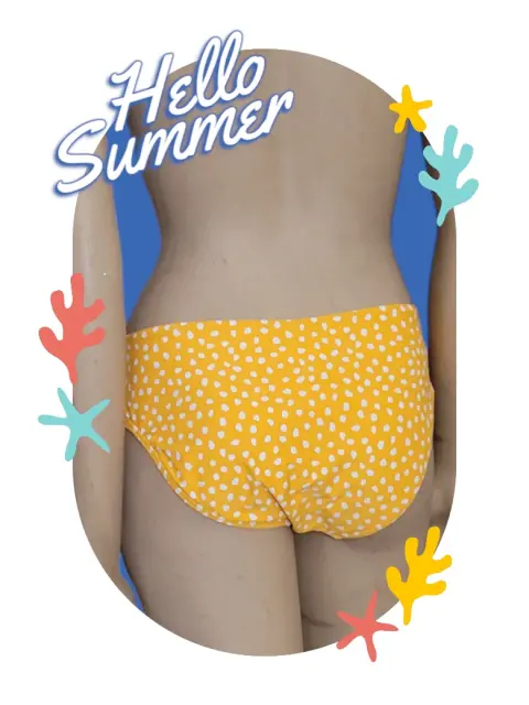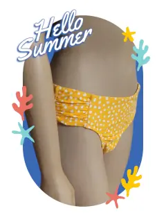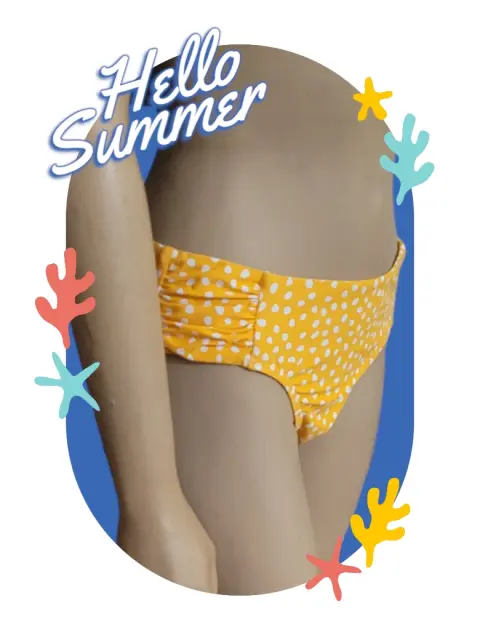 Nip Tuck bikini bottom calzon Polka-dots, talla mediana, color amarillo con puntos blancos, detalle arrugado a los lados, forrado por dentro, cubierta total en parte trasera, hecho de poliéster y elastano, mide 36cm de cadera con 26cm de alto, nuevo a estrenar con etiqueta