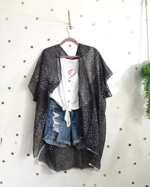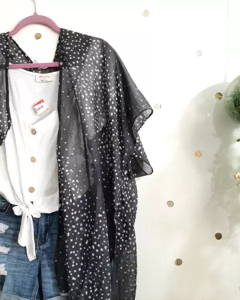 Pareo-kimono fresco negro/ blanco. Luce espectacular en la playa con este pareo- kimono también puedes usarlo en tu outfit diario luce mucho!! Tejido ligero, fresco,suave y muy cómodo!! Nuevo!! Diseño súper lindo con puntos blancos fondo negro!! Unitalla queda perfecto desd talla XS hasta 3XL!! Para más modelos disponibles consulta mi clóset!! Con gusto resuelvo cualquier duda!!