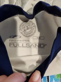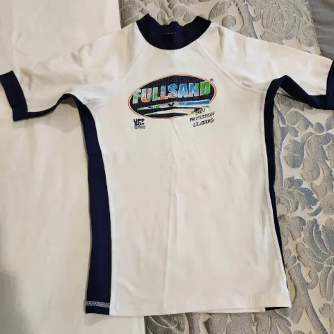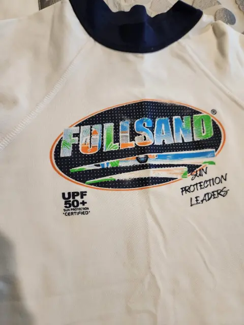 Playera Fullsand niño. Playera Fullsand de niño color blanco con azul, en excelentes condiciones, ideal para las vacaciones y proteger a nuestros pequeños de los rayos solares. Talla XG de niño va bien hasta una talla 12