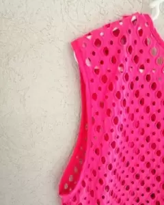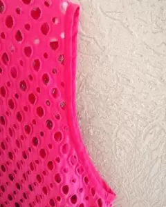 Salida de baño fiusha tipo crochet. Es una salida de baño muy femenina, tipo crochet, color fiusha. Llega un poco más abajo de la cadera. Mide 55cm de axila a axila y 75cm de largo.