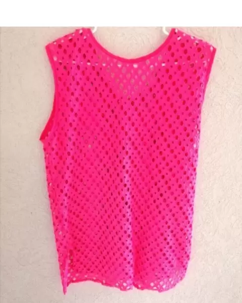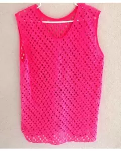 Es una salida de baño muy femenina, tipo crochet, color fiusha. Llega un poco más abajo de la cadera. Mide 55cm de axila a axila y 75cm de largo.