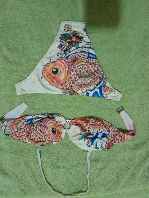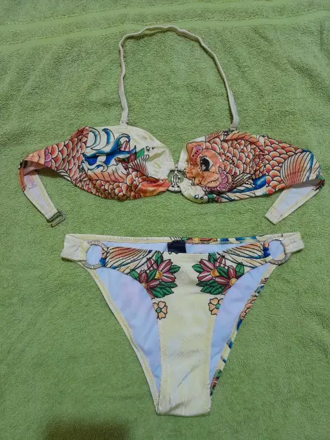 Bikini con estampado de pez y aplicaciones que lo hacen brillar, es nuevo sin etiquetas, marca Christian Audigier, talla S.