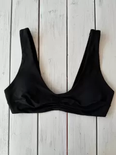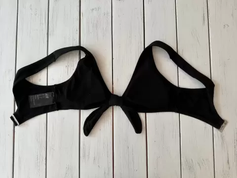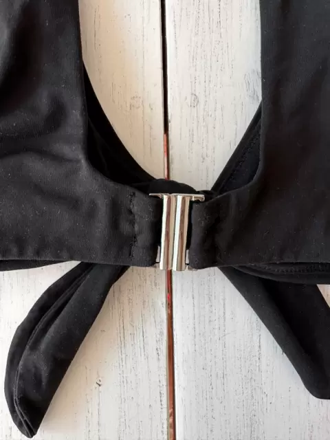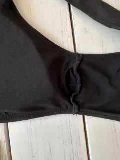 Top bikini negro con broche trasero, trae copas y espacio para quitarlas, el moño al frente se puede quitar. Talla: 4Medidas aproximadas: 31 cm debajo del busto.