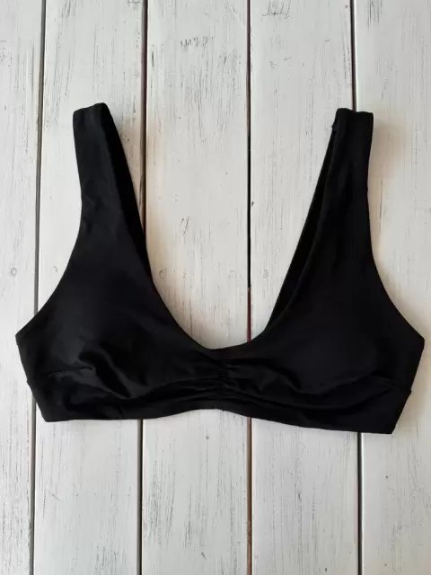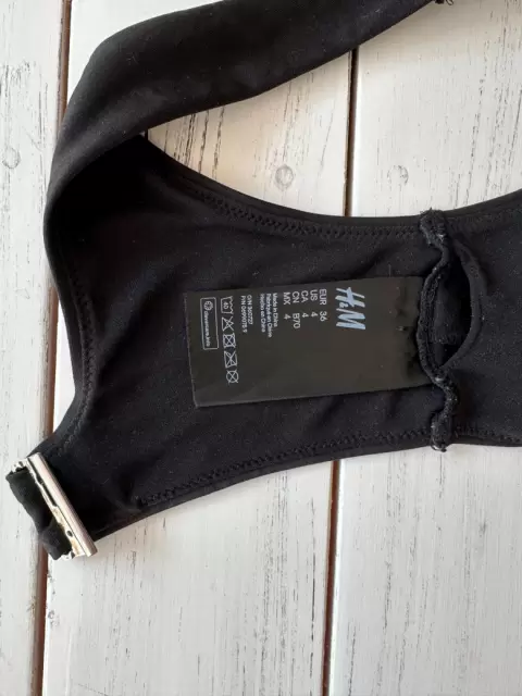 Top bikini negro H&M. Top bikini negro con broche trasero, trae copas y espacio para quitarlas, el moño al frente se puede quitar. Talla: 4Medidas aproximadas: 31 cm debajo del busto.
