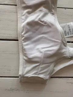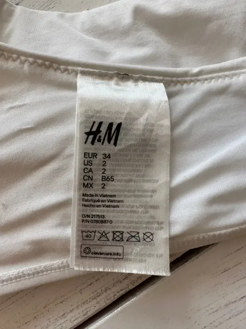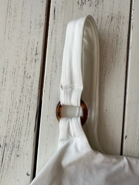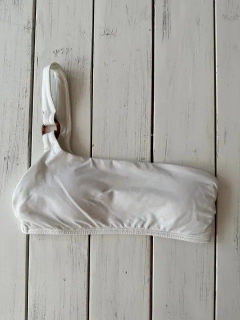 Top de bikini blanco a un hombro, aro de material tipo carey, con copas. Talla: 2 Medidas: 27 cm debajo del busto