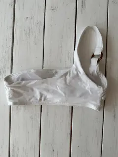 Top de bikini un hombro. Top de bikini blanco a un hombro, aro de material tipo carey, con copas. Talla: 2 Medidas: 27 cm debajo del busto