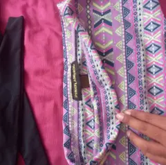 Traje de baño de 2 piezas la parte del busto es para amarrarse como se muestra en las fotos tiene sus esponjas es talla unitalla no se recomienda para busto grande, el calzon es de tela gruesa no esta roto se encuentra en buenas condiciones con diseño colorido es calzon llega hasta la cintura en la etiqueta menciona chica- mediana.