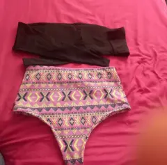 Traje de baño. Traje de baño de 2 piezas la parte del busto es para amarrarse como se muestra en las fotos tiene sus esponjas es talla unitalla no se recomienda para busto grande, el calzon es de tela gruesa no esta roto se encuentra en buenas condiciones con diseño colorido es calzon llega hasta la cintura en la etiqueta menciona chica- mediana.