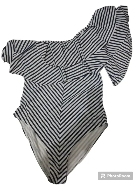 Traje de baño. Color. Blanco/franjas azul marinoVuelos al frente, un hombro descubiertoForrado en su interior al frente82% poliamida 18% elastano