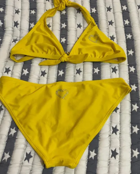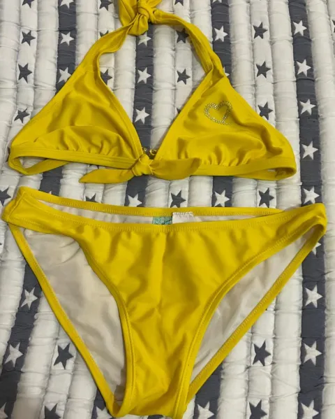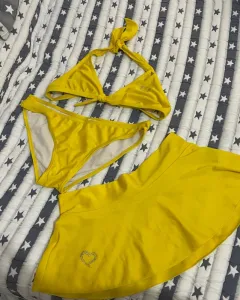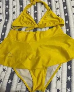 Traje de baño amarillo, 3 piezas, bikini, sostén y falda material Licra. Usado. Talla CH