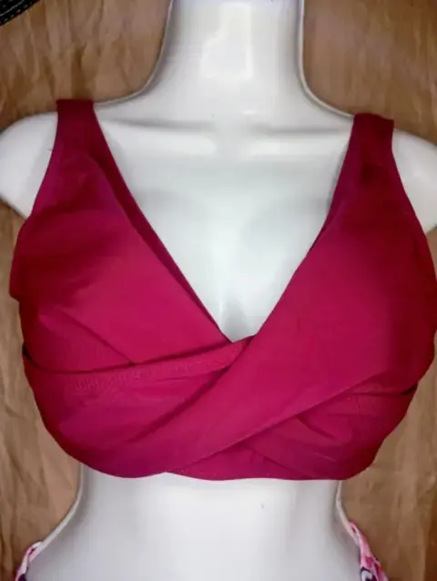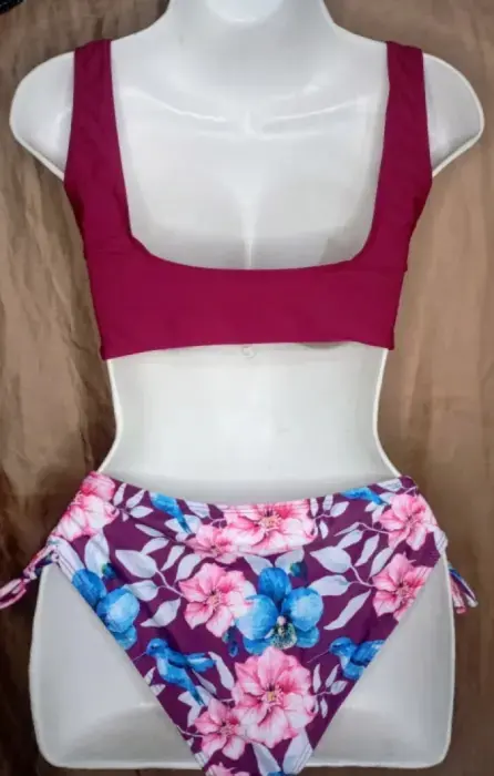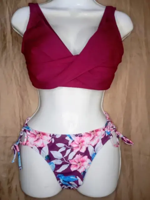 Lindo traje de baño de dos piezas, fucsia con flores. Nuevo, talla M.La parte de arriba con almohadillas en el pecho.La parte de abajo es cintura media , se anuda a los lados y tiene protector.En la tercer foto puedes checar la tabla de medidas.82% poliéster - 18% elastano.