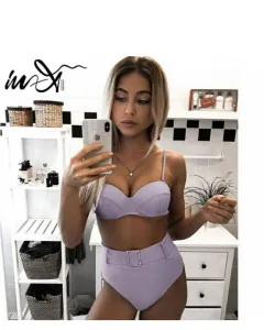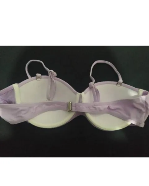 Traje de baño cintura alta talla M, con copas preformadas (34b), color lila, con piedras brillantes en el cinturón. Guia de tallas última foto