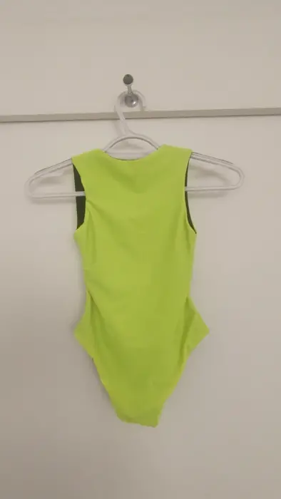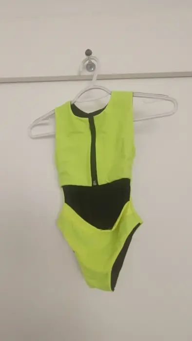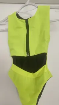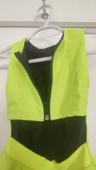 Para niña. Color limón con negro. Coqueto cierre al frente se le va a ver hermoso. Con mangas para proteger sus hombros del Sol. Muy cómodo y no muy escotado.