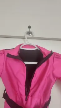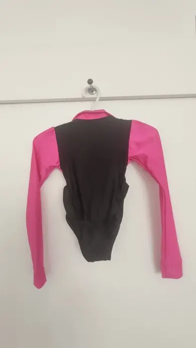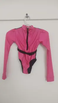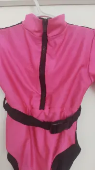 Para niña. Color rosa mexicano con negro. Coqueto cierre al frente se le va a ver hermoso. Con mangas para proteger sus hombros del Sol. Muy cómodo y no muy escotado.