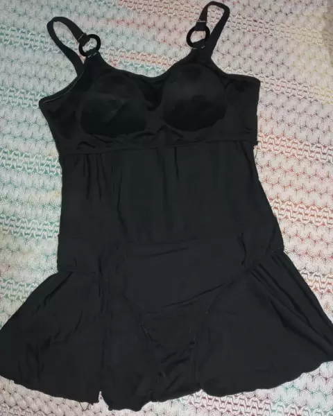 Traje de baño con falda. Cómodo y bonito traje de baño en color discreto. Enterizo con una faldita que ayuda a disimular ciertas zonas