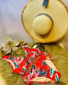 Hermoso set de playa, el cuál incluye un bello traje de baño en 2 piezas completamente nuevo con sello de seguridad, talla: M. Color: rojo, decorado con lindas hojas. Precioso sombrero, que combinará a la perfección con tu traje de baño y ropa de playa favorita.
