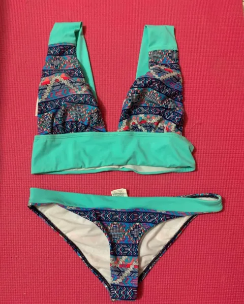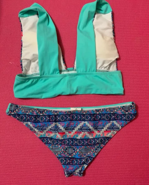 Hermoso traje de baño de 2 piezas, en tonos turquesas, azul y rosa. Talla medianaNo dudes en preguntar si tienes dudas o si quieres ofertar por la prenda ☺️