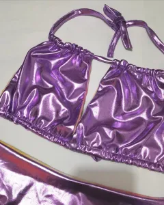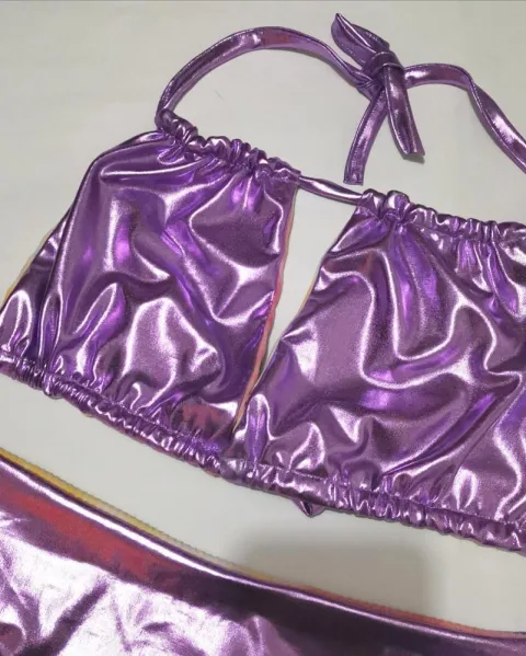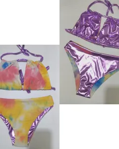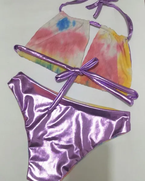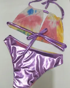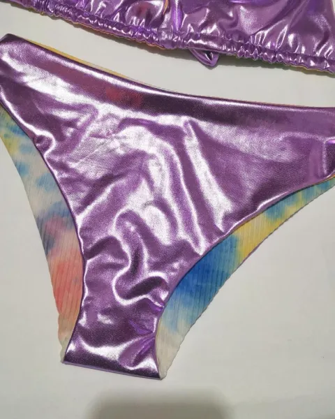 Traje de baño de 2 piezas doble vista :vista metalica lila y vista tie die, parte superior con cintas ajustables, parte inferior strech se ajusta muy bien nuevo sin detalles disponible, también tenemos la Diadema o el scrunchie a juego con costo extra de 60 pesos