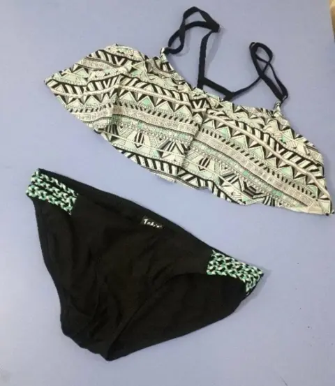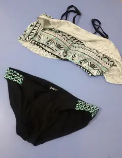 Bonito traje de baño armado con top diseño greco tribal en colores blanco, negro y verde menta, marca Arizona talla m, el bikini color negro con vistas en color verde menta talla chica. El top puede quedar a chica, trae tirantes ajustables y holan muy favorecedor.