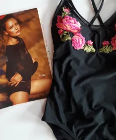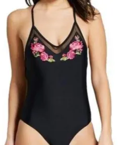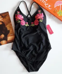 Nuevo traje de baño completo negro bordado floral es talla mediana.