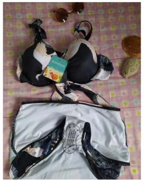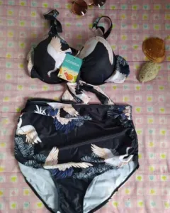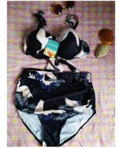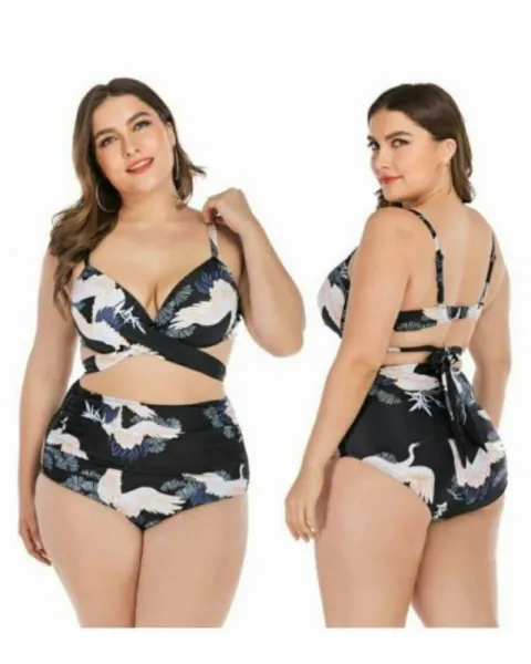 Traje de baño cintura alta talla XL, con copas preformadas (38B), estampado de aves. Guia de tallas última foto