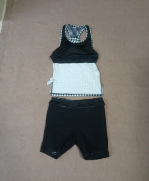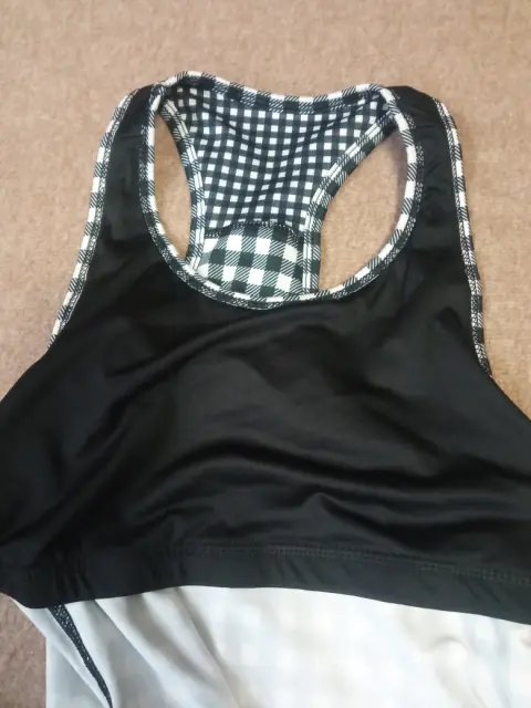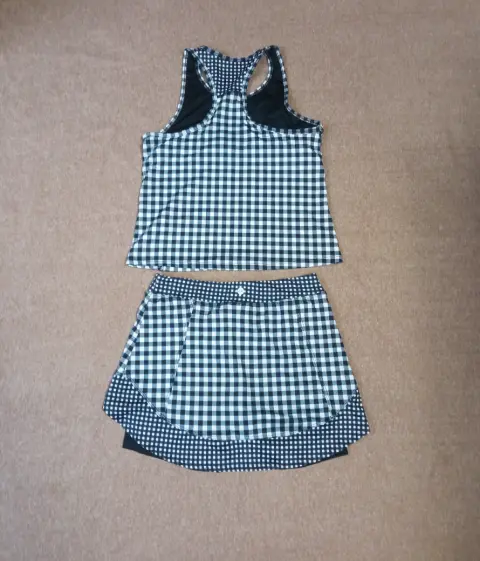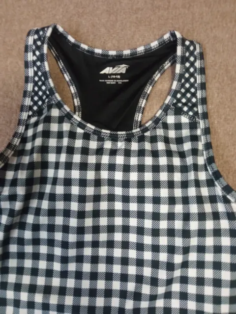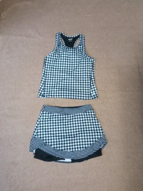 Avia conjunto deportivo niña talla 10-12. Avia conjunto deportivo a cuadros en blanco y negro para niña talla: 10-12.Materiales: Exterior 88% poliéster reciclado, 12% spandex. Interior : 88% poliéster y 12% spandex. Medidas: short-falda 32cm de largo, 64 cm de cintura y 72 cm de anchoCamiseta: 52 cm de largo, 70 cm de axila a axila, 62 cm de cintura. Usado puesto una vez.