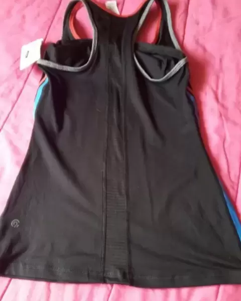 Blusa sin mangas deportiva de licra y algodón color negro y en los costados unas rayas verticales azules y rojas talla XS nueva con etiqueta acentua la figura por su diseño que tiene marcada la cintura con top integrado