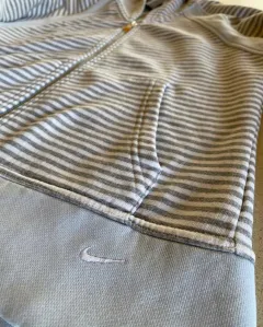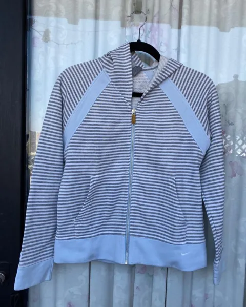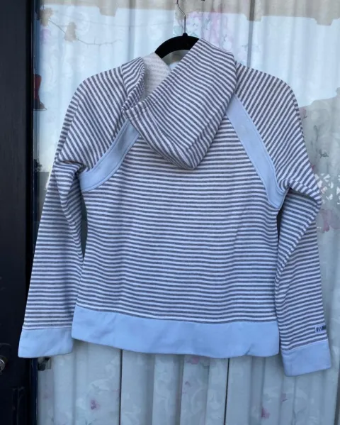 Chamarra deportiva a rayas. Color blanco con rayas en gris claro, puños y vistas en azul cielo. Tiene capucha que puedes utilizar para cubrirte del fío o del viento o puedes dejarla suelta