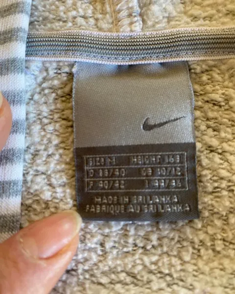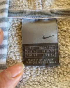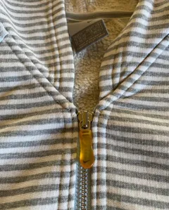 Color blanco con rayas en gris claro, puños y vistas en azul cielo. Tiene capucha que puedes utilizar para cubrirte del fío o del viento o puedes dejarla suelta