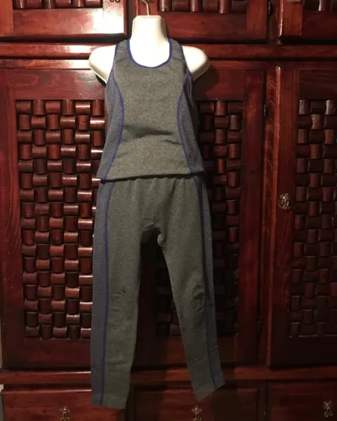 Conjunto deportivo. Conjunto deportivo en color gris con detalles en color morado , es unitalla pero le viene mejor a una talla S incluye playera de tirantes anchos y leggin ajusta muy padre al cuerpo