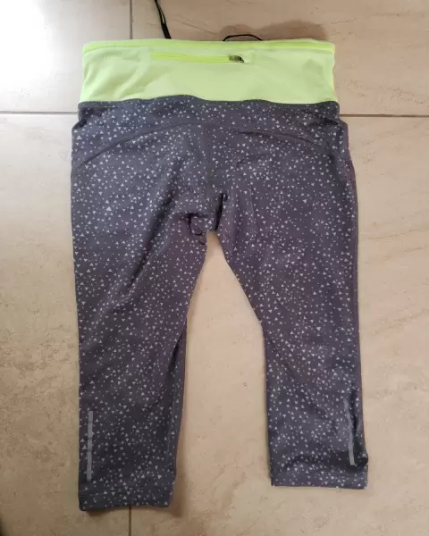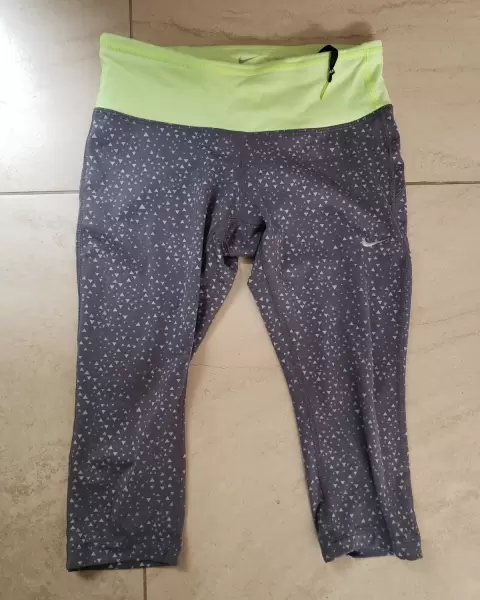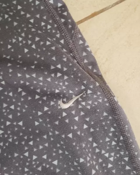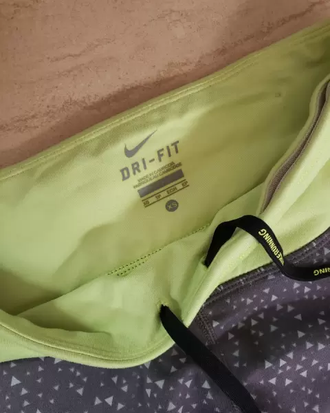 Leggings nike gris. No tiene detalles, tiene una linda bolsita en la parte de atras y trae cierre es gris con puntos blancos y vistas verde