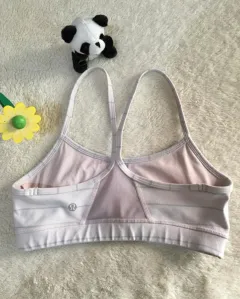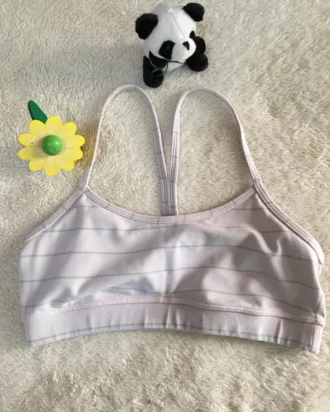 Lululemon flow Y bra IV, color rosa palo con rayas grises, el color del forro es piel, por eso la apariencia, usado pero aún en muy buena condición, soporte medio, talla 4.
