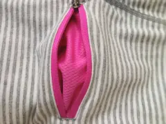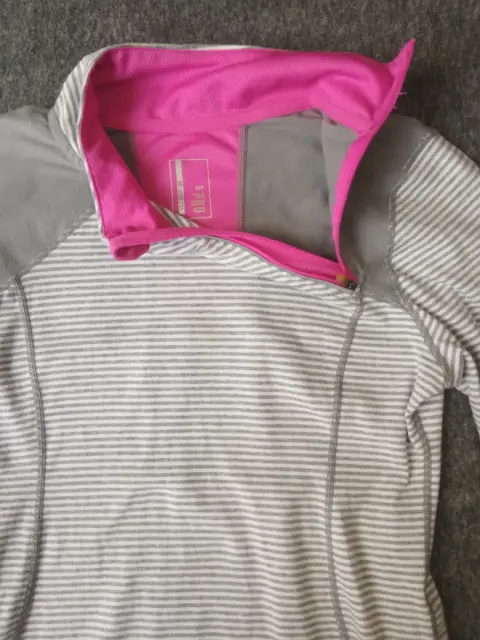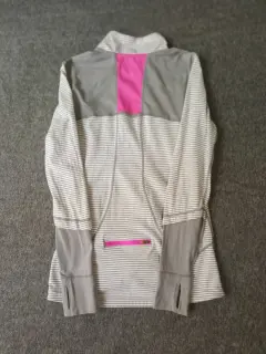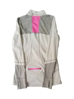 Mondetta camisa trainning manga larga.. Mondetta camisa manga larga para entrenamiento de mujer en color gris-rosa. Talla Small.Este swettshirt de entrenamiento a rayas, cuenta con cierre cruzado en el cuello alto, dos bolsas delanteras y una trasera con cremallera, además de hoyos en las mangas para los pulgares. Medidas: 60 cm de largo, 62 cm de ancho en espalda -pecho, 72 cm en cintura, 62 cm en mangas.Materiales: 95% algodón y 5% spandex.