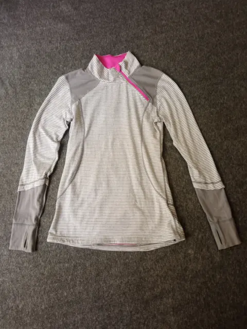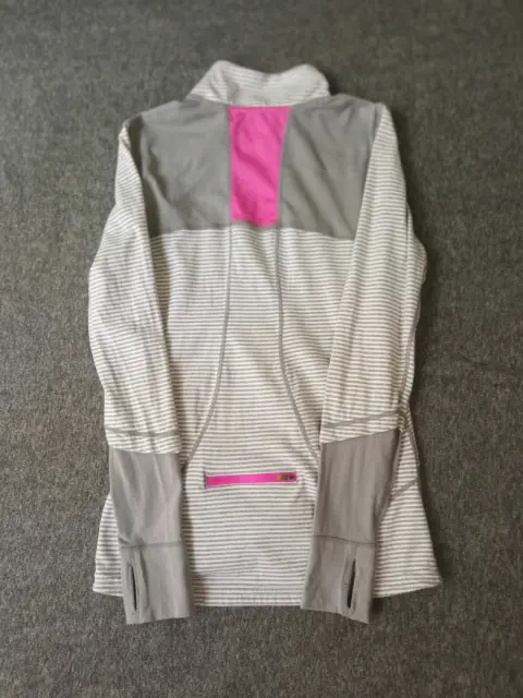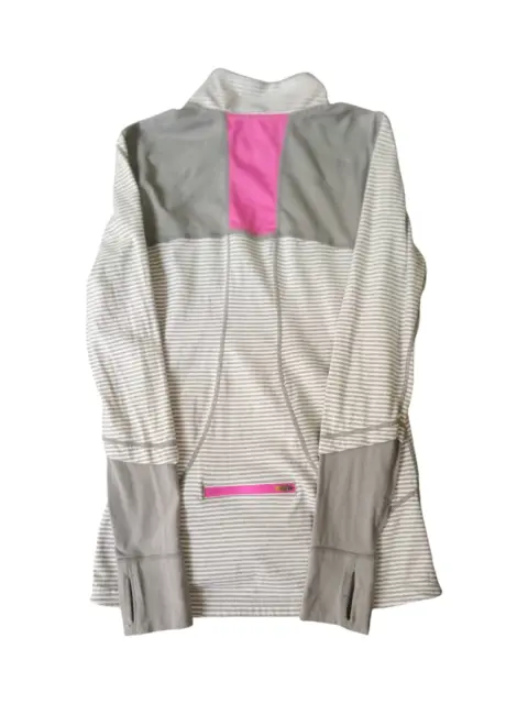 Mondetta camisa manga larga para entrenamiento de mujer en color gris-rosa. Talla Small.Este swettshirt de entrenamiento a rayas, cuenta con cierre cruzado en el cuello alto, dos bolsas delanteras y una trasera con cremallera, además de hoyos en las mangas para los pulgares. Medidas: 60 cm de largo, 62 cm de ancho en espalda -pecho, 72 cm en cintura, 62 cm en mangas.Materiales: 95% algodón y 5% spandex.