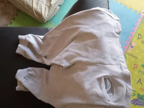 Pans pesquero color gris, con lineas y un número al frente, con bolsas al frente