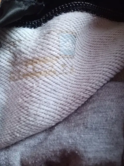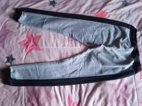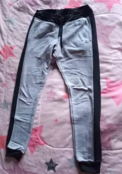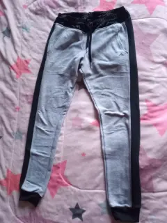 Gris y franjas color negro a los costados, bolsillos, y jareta en la cintura para ajustar, en perfectas condiciones, sin detalles...