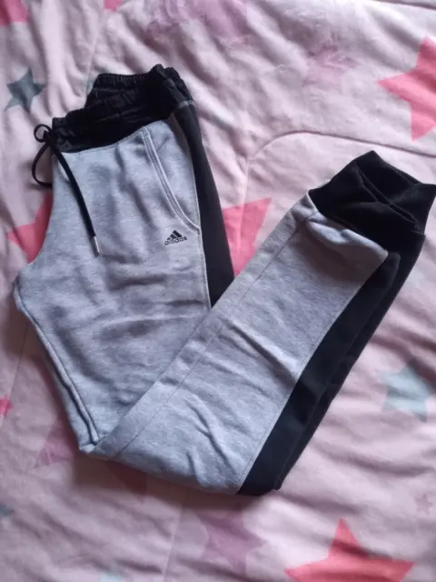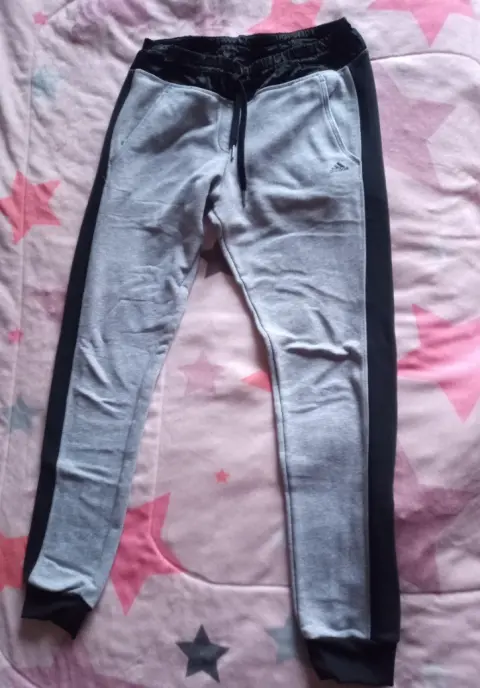 Pants adidas. Gris y franjas color negro a los costados, bolsillos, y jareta en la cintura para ajustar, en perfectas condiciones, sin detalles...